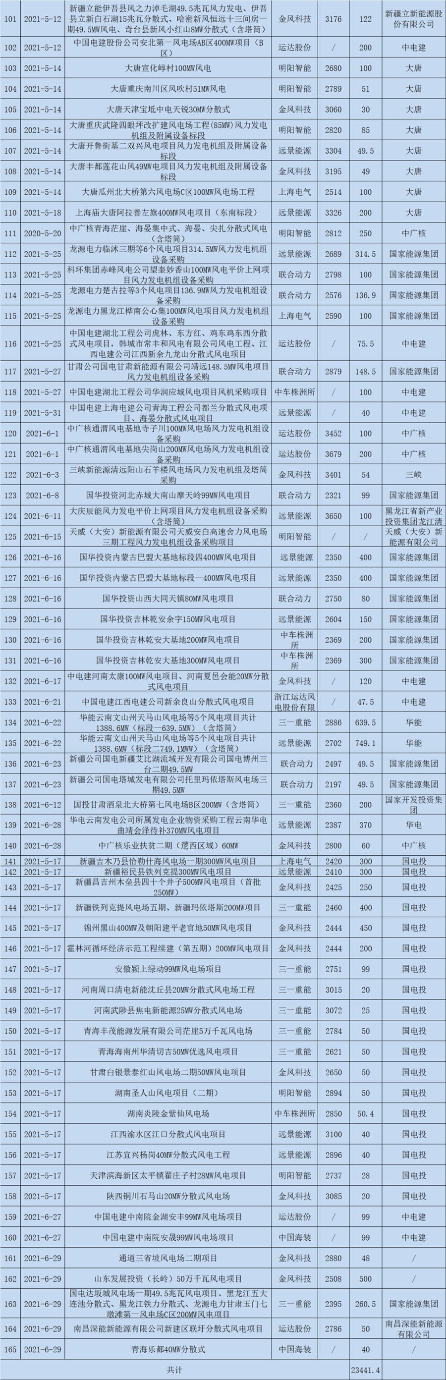 以下为风芒能源统计的2021上半年整机中标情况细表(工程量比较大,个别细节问题请多包涵)