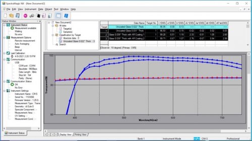 针对这一点,柯尼卡美能达分光测色计可满足测量玻璃涂上抗反射涂层前后的光反射率这一需求,帮助客户精准评估涂层性能。柯尼卡美能达传感事业部使用分光测色计CM-5和电脑软件Spectramagic NX进行对比试验。其中,红线作为标准玻璃(即未涂有抗反射图层的玻璃)数据。对另一件厚度与标准玻璃略有差异的样品进行测量,也绘制出了与红线几乎重合的蓝色光谱曲线。另外两件样品涂有抗反射涂层,在360nm至740nm的波长范围内,均显示出高于标准的透过率。