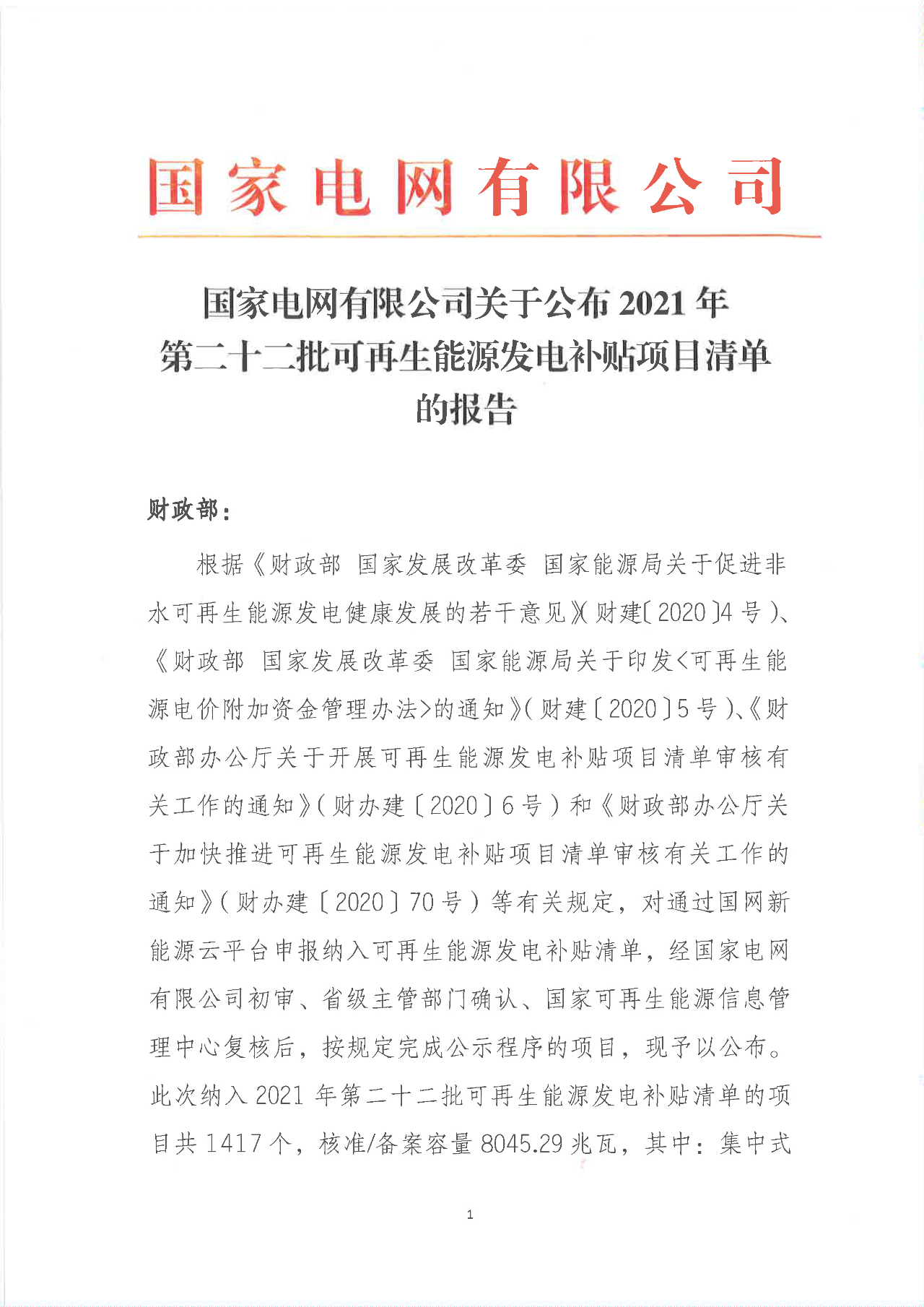 根据《财政部 国家发展改革委 国家能源局关于促进非水可再生能源发电健康发展的若干意见》(财建〔2020〕4号)、《财政部 国家发展改革委 国家能源局关于印发<可再生能源电价附加资金管理办法>的通知》(财建〔2020〕5号)、《财政部办公厅关于开展可再生能源发电补贴项目清单审核有关工作的通知》(财办建〔2020〕6号)和《财政部办公厅关于加快推进可再生能源发电补贴项目清单审核有关工作的通知》(财办建〔2020〕70号)等有关规定,国家电网有限公司积极配合各省级能源主管部门和国家可再生能源信息管理中心,为符合中央财政补助条件的可再生能源发电项目提供补贴清单申报服务。根据《财政部关于下达2021年可再生能源电价附加补助资金预算的通知》(财资〔2021〕94号)规定,2019年底前完成并网的项目,原则上应在2021年底前完成补贴清单审核;2020年起并网的项目,原则上应在并网后一年内完成补贴清单审核。2021年11月30日,我公司已将完成公示的2021年第二十二批可再生能源发电项目补贴项目清单上报国家主管部门,已公布项目清单及后续项目审核进展情况,请登录新能源云平台查询。