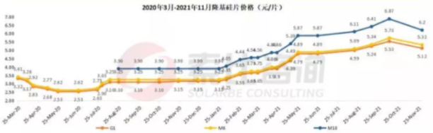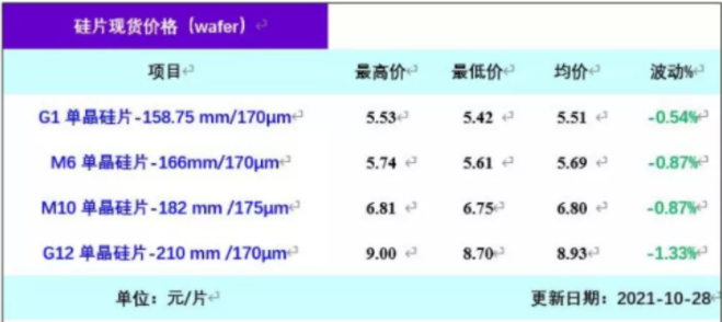10月下旬,因光伏产业链价格持续上涨,终端电站建设需求低迷,硅片出现了小幅下滑的迹象。由于对年末抢装的预期,硅片价格随后企稳。