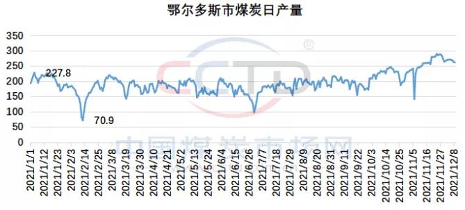 供应出天量,全力保障今冬明春用煤安全。11月下旬以来鄂尔多斯保供产能释放明显加速,产量直逼290万吨/日。进入12月份也一直维持在260-270万吨/日的相对高位。产量顶部小幅下降,一是天气影响生产,二是下游采购积极性有所下降,在以销定产、坑口存煤能力有限的情况下,产量随销量减少而下降。根据CCTD中国煤炭市场网重点监测的数据显示,12月上旬,鄂尔多斯日均产量268万吨/日,旬环比减少14万吨/日。