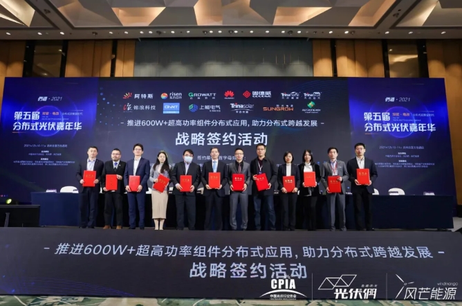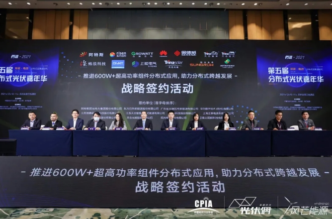 为了进一步推动分布式场景的光伏发展,12月10日,全球领先光伏组件企业阿特斯、东方日升、天合光能携天合智慧分布式、正泰太阳能,以及7家主流逆变器厂商固德威、古瑞瓦特、华为、锦浪科技、上能电气、阳光电源和正泰电源(按首字母排序),共同举行了战略签约仪式,联合声明共同推进600W+超高功率组件分布式应用,构建600W+分布式应用体系,推动分布式产业结构高端化、分布式能源消费低碳化转型。