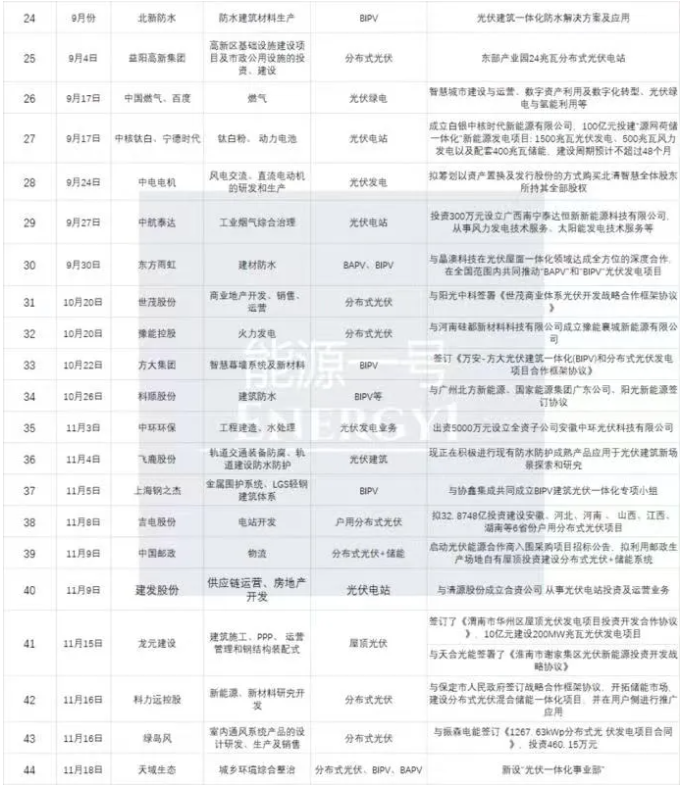 能源一号在梳理数据中也发现另一个亮点:大量公司扎堆进入了分布式产业中。其中有一些著名的上市公司及集团企业如建发股份、龙元建设、京东、顺丰控股、中材国际、凯伦股份、靖远煤电、格力电器、杭萧钢构、创维、塔牌集团等。