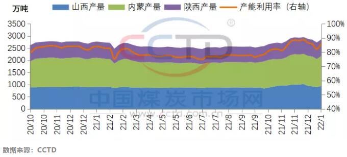 近期产地煤炭供应维持在较高水平。进入1月份,前期已完成年度生产任务停产的煤矿陆续恢复生产,加之印尼煤出口禁令事件持续发酵,下游采购情绪逐步回暖,矿上拉煤车渐增,受此影响,在产煤矿产量快速提升,根据CCTD中国煤炭市场网监测的数据显示,1月份以来,鄂尔多斯地区煤炭日均产量达276万吨/日,环比12月下旬增长8.8%,其中,单日最高值达293万吨;1月9日当周,晋陕蒙442家煤矿产量回升至2855万吨,环比上周增长4.6%。