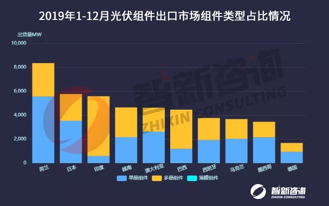 从出口区域市场来看,荷兰出货量8.35GW,出口额21.17亿美元,排名第一,日本出货量5.77GW,出口额16.01亿美元,位居第二,印度出货量5.58GW,出口额12.41亿美元,排名第三。