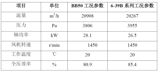 表1 曲叶型系列离心风机与引进技术BB50离心风机的比较