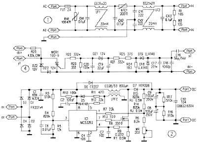 MC33262是一款可靠且成本低廉的功率因数校正芯片,其应用电路如图2所示。市电经电源滤波器和整流器得到脉动直流电。电流通过启动电阻R10向C2充电至10V时,IC1开始工作。整流后的直流脉动电压在R5的分压作为取样信号经IC1的③脚输入乘法器。直流输出电压在R6和WR上的分压经①脚输至误差放大器的反相输入端,与2.5V的参考电压比较放大后输出一个直流误差电压,同时也输入到乘法器。通过功率开关MOSFET的电流在源极电阻R9上转换为电压信号,输入到IC1的④脚,并与乘法器的输出电压进行比较。随AC电压从零到峰值正弦地通过,乘法器的输出电压控制IC④脚的阀值,从而使Q1的峰值电流跟踪AC输入电压,致使校正电路的负载呈电阻性。