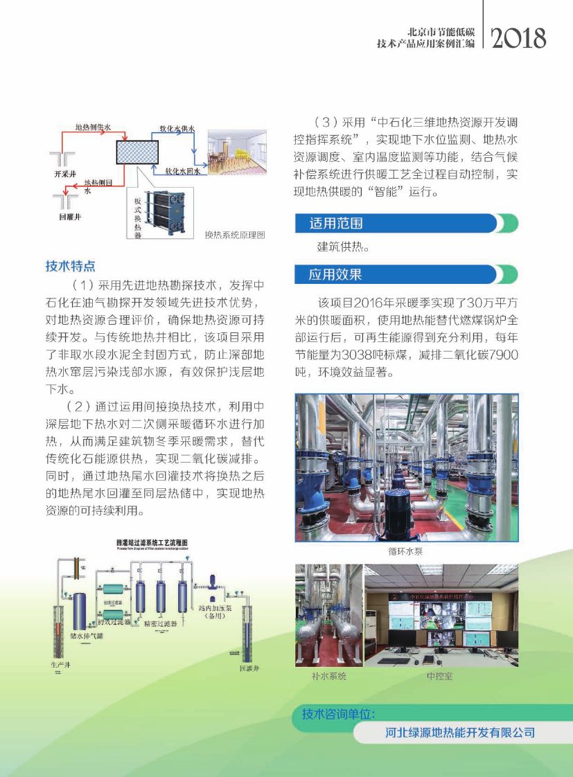 该技术利用地热水采灌均衡技术、管网水力平衡技术和间接换热技术,利用中深层地下热水对二次侧供暖循环水进行加热,满足建筑物冬季供暖需求。该技术运用非取水段水泥全封固方式和地热尾水回灌技术,防止深部地热水窜层污染浅部水源以及地热水对小区管网、末端的腐蚀。