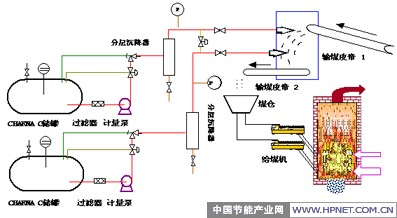 使用时用专用泵喷出与粉煤混合。地点可以选在进料口的输粉管道处,或在传送带输送燃料到锅炉时向煤喷洒或在称重处向胶带输送机上喷洒。人工/自动控制定速定量供给。